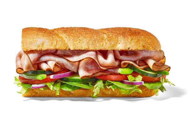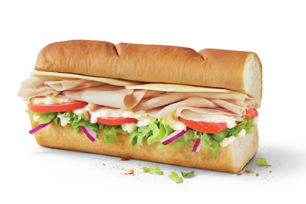 6”, Hearty Multigrain, Oven-roasted Turkey, Black Forest Ham, Lettuce, Spinach, Tomatoes, Cucumbers, Red Onions, Yellow Mustard