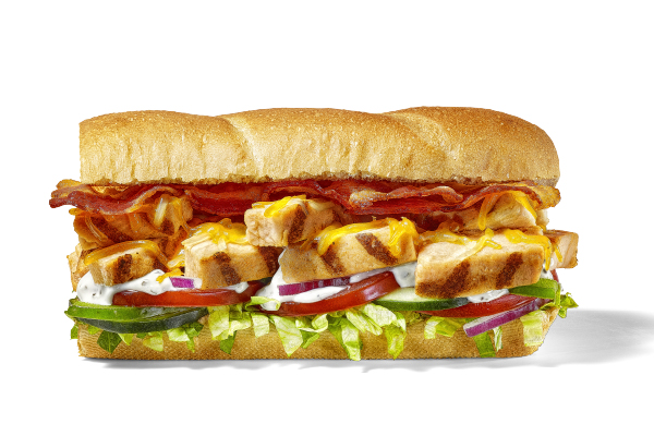 Footlong, Toasted Artisan Italian, Bacon, Rotisserie-Style Chicken, Monterey Cheddar, Lettuce, Tomatoes, Red Onions, Peppercorn Ranch