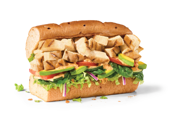 6”, Toasted Hearty Multigrain, Grilled Chicken, Sliced Avocado, Lettuce, Spinach, Tomatoes, Cucumbers, Red Onions, Baja Chipotle