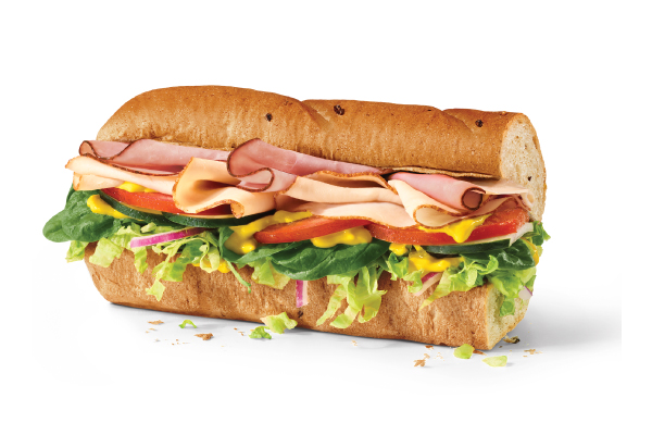 6”, Hearty Multigrain, Oven-roasted Turkey, Black Forest Ham, Lettuce, Spinach, Tomatoes, Cucumbers, Red Onions, Yellow Mustard