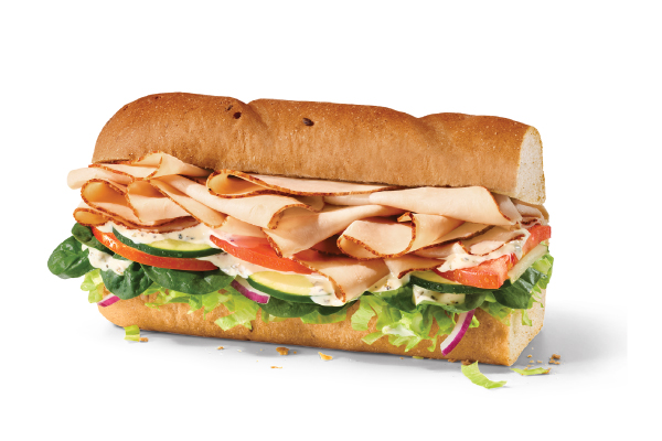 6”, Hearty Multigrain, Oven-roasted Turkey, Lettuce, Spinach, Tomatoes, Cucumbers, Red Onions, Peppercorn Ranch