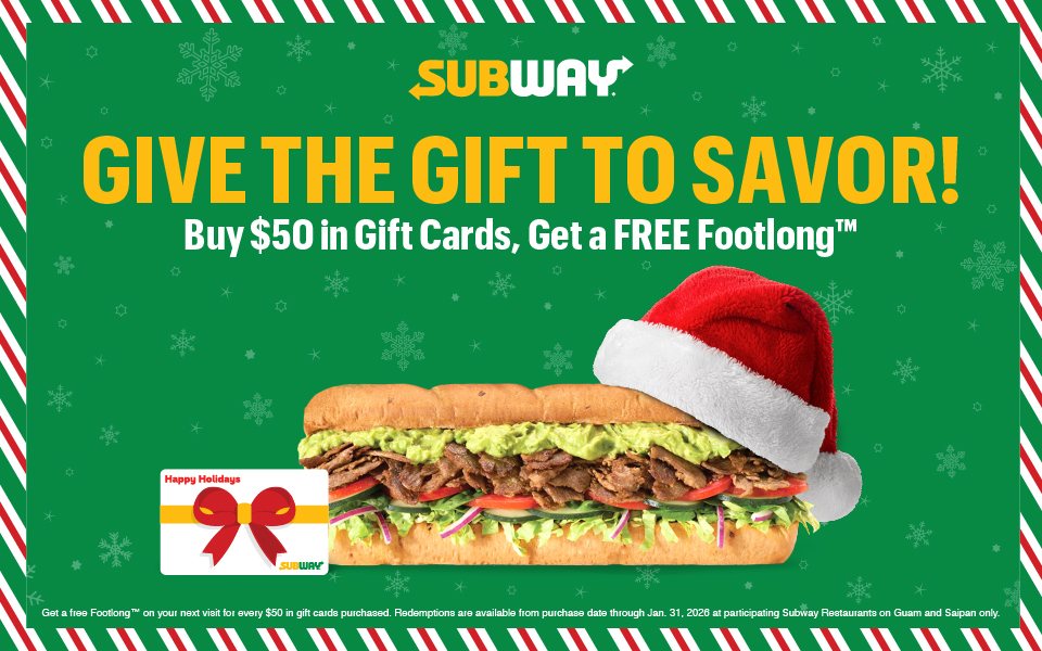 Visit a Subway near you to get your FREE Footlong™ with purchase of $50 in Subway Holiday Gift Cards. Hurry! Available through Dec. 31, 2025 only.